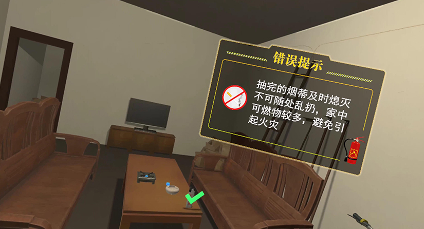 體驗(yàn)人員在90平方的房子中,體驗(yàn)人員可以在廚房、客廳、臥室移動(dòng),三個(gè)房屋空間中存在許多消防隱患,體驗(yàn)者需要一一指出。