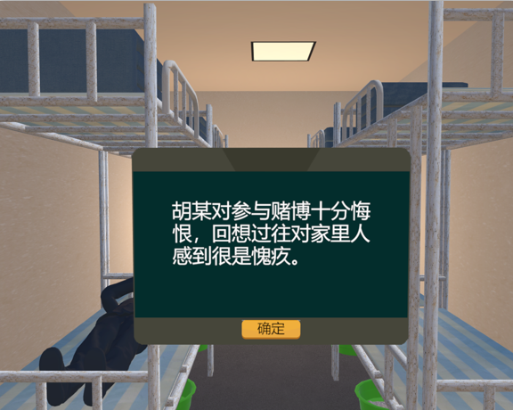 本系統(tǒng)以社區(qū)矯正人員胡某參與賭博的視角。進行了胡某朋友拉人賭博,胡某女兒進行勸阻,胡某置之不理參與賭博,賭博時被捕,被捕后深深懊悔,釋放后被催債,后來妻離子散,感到整個世界都崩塌了的體驗。內(nèi)容故事流程:1.進入VR世界中,介紹背景,擁有美好家庭。2.有朋友湊打麻將,女兒對你進行勸說,不顧勸說進行打麻將活動。3.打麻將過程中警察進入,將社矯人員進行抓捕。4.因在社矯期間進行賭博,撤銷監(jiān)外執(zhí)行,執(zhí)行收監(jiān)。5.在監(jiān)中回想種種過往,對過往進行反思后悔。6.由于賭博造成外...