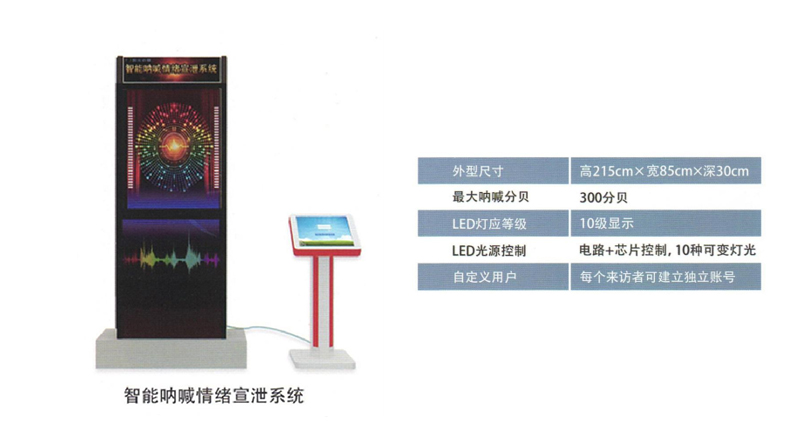智能引導(dǎo)正向激勵(lì):系統(tǒng)智能分析宣泄者的行為(包括吶喊分貝、宣泄時(shí)間等因素),判斷出其情緒宣泄的程度,根據(jù)不同宣泄的程度進(jìn)行智能化的正向語(yǔ)音引導(dǎo)、激勵(lì),并給予建議方案。多種宣泄情緒主題:系統(tǒng)提供了8種常見(jiàn)的情緒問(wèn)題而設(shè)定的宣泄主題,用戶(hù)使用前先通過(guò)觸摸屏控制器選擇符合自己情緒的宣泄主題。系統(tǒng)設(shè)置管理員登陸口,方便管理及調(diào)取記錄。