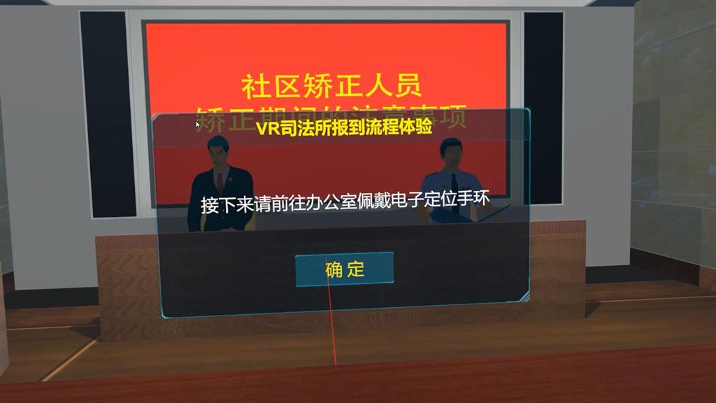 模擬整個(gè)司法報(bào)到和辦理社區(qū)矯正等流程,體驗(yàn)者以第一視角攜帶相關(guān)證明到司法所完成相應(yīng)的報(bào)到程序,包括進(jìn)入司法所、填寫信息、做心理健康測試、宣讀矯正規(guī)定、佩戴電子手環(huán)等。