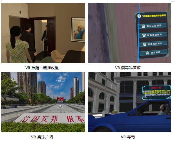 針對(duì)矯正人員在社會(huì)中可能遇到的高風(fēng)險(xiǎn)事件與環(huán)境,創(chuàng)建了《酒駕》《毒駕》《賭博》等多類型多主題的體驗(yàn)場(chǎng)景。通過(guò)模擬這些行為帶來(lái)的嚴(yán)重后果,如交通事故、健康損害、家庭破裂等,加強(qiáng)矯正對(duì)象對(duì)社矯期間造成不良后果的認(rèn)識(shí),從而增強(qiáng)其身份認(rèn)識(shí)和守法意識(shí)。同時(shí)為了幫助社區(qū)矯正對(duì)象增強(qiáng)法治意識(shí),從社區(qū)矯正對(duì)象轉(zhuǎn)變?yōu)?#8220;法律明白人”,創(chuàng)建《禁毒科普》《防詐騙》《憲法廣場(chǎng)》、《廉政館》等法律法規(guī)宣傳內(nèi)容,讓矯正對(duì)象學(xué)習(xí),以此樹(shù)立正確的人生觀和價(jià)值觀。除此之外,還是設(shè)計(jì)《VR監(jiān)獄生活體驗(yàn)》場(chǎng)景,通過(guò)利用VR技術(shù)全方位呈現(xiàn)監(jiān)獄環(huán)境,讓矯正人員能身臨其境地感受違反犯罪后被收監(jiān)執(zhí)行的監(jiān)獄生活,以此加強(qiáng)社矯對(duì)象的身份認(rèn)識(shí)和守法意識(shí),起到震撼警示教育作用。