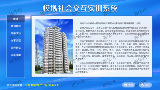 模擬社會交互實(shí)訓(xùn)系統(tǒng)具備6種模擬業(yè)務(wù)辦理知識,涵蓋民政、房產(chǎn)、公證、工商、司法所及派出所等關(guān)鍵社會服務(wù)領(lǐng)域,每個模塊均細(xì)分為5個子部分,分別是繪聲繪影、業(yè)務(wù)認(rèn)知、法律講堂、隨堂測驗(yàn)、聯(lián)系直通車,旨在通過多角度、多層次的交互體驗(yàn),深化服刑人員對每一個業(yè)務(wù)流程的理解和掌握。