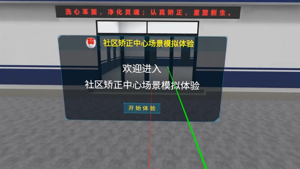 進(jìn)入VR場景,體驗者站在社區(qū)矯正中心大門前,點擊手柄即可進(jìn)入內(nèi)部。大廳內(nèi),系統(tǒng)語音隨即介紹中心的主要職責(zé)與區(qū)域劃分。隨后,體驗者可自由漫游至各功能室,系統(tǒng)會詳細(xì)介紹每室的功能及在社區(qū)矯正中的作用。此外,大廳還設(shè)有互動答題環(huán)節(jié),增強體驗趣味性與知識性。