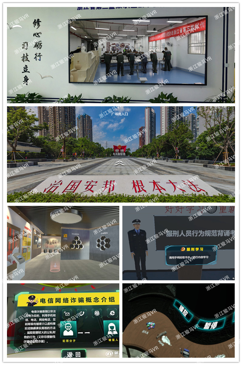 通過“VR禁毒館科普館”、“VR防詐騙體驗(yàn)”、“VR憲法廣場(chǎng)”、“VR廉政體驗(yàn)館”、“VR監(jiān)獄生活體驗(yàn)”、“浙江省第三監(jiān)獄實(shí)訓(xùn)基地VR場(chǎng)景”等系統(tǒng),讓社矯對(duì)象認(rèn)清危害行為的同時(shí)加深悔罪意識(shí),從而實(shí)現(xiàn)“心有所戒,行有所止”的教育效果。