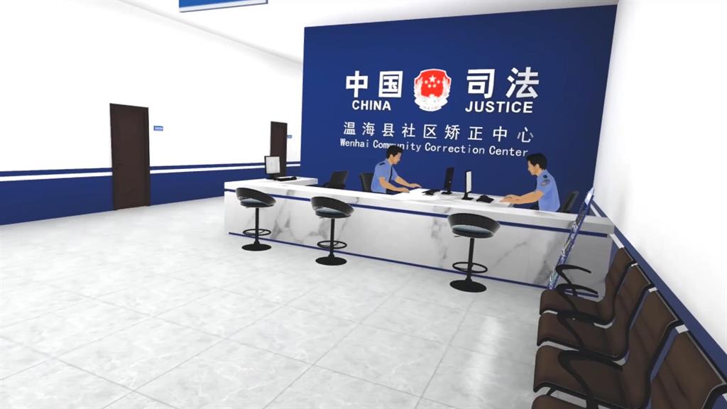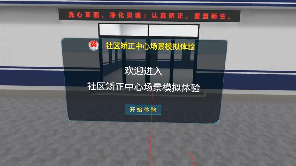 進入VR場景,體驗者站在社區(qū)矯正中心大門前,點擊手柄即可進入內(nèi)部。大廳內(nèi),系統(tǒng)語音隨即介紹中心的主要職責(zé)與區(qū)域劃分。隨后,體驗者可自由漫游至各功能室,系統(tǒng)會詳細介紹每室的功能及在社區(qū)矯正中的作用。此外,大廳還設(shè)有互動答題環(huán)節(jié),增強體驗趣味性與知識性。