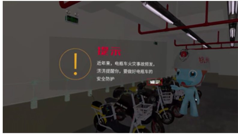 體驗(yàn)人員在地下車(chē)庫(kù)中,電瓶車(chē)突然起火,需根據(jù)火情和系統(tǒng)提示對(duì)小范圍著火進(jìn)行滅火和應(yīng)對(duì)大范圍火災(zāi)逃生。