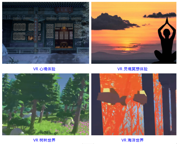 對(duì)于精神壓力較大、具有焦慮、抑郁等負(fù)性情緒的對(duì)象,則利用3D全景視頻,構(gòu)建了《VR心境體驗(yàn)》、《VR海洋世界》、《VR靈境冥想體驗(yàn)》、《VR樹(shù)林世界》等輕松場(chǎng)景,再結(jié)合內(nèi)觀療法、音樂(lè)治療等心理學(xué)療法,從生理、心理兩方面緩解精神壓力,舒緩焦慮、抑郁等負(fù)性情緒。