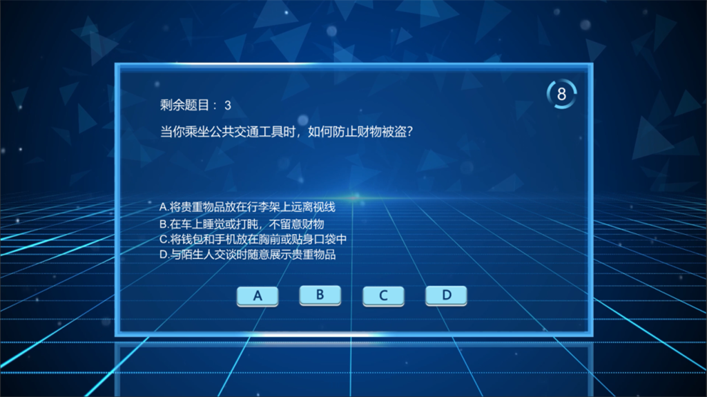 針對搶盜風(fēng)險,系統(tǒng)以互動答題的形式模擬日常生活中可能遇到的搶劫、盜竊等突發(fā)情況。例如,在公共場所的休息區(qū),如何防止財物被盜,或在公共場所財物被盜等場景。用戶需要在模擬情境中選擇正確的應(yīng)對措施,系統(tǒng)會根據(jù)用戶的選擇提供實時反饋,幫助用戶學(xué)習(xí)如何冷靜應(yīng)對,采取正確的自我保護(hù)措施。
