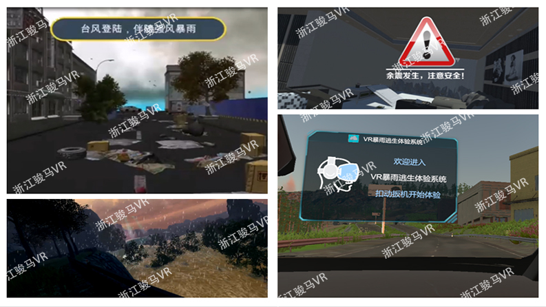 自然災害體驗系統(tǒng)中包含了“VR泥石流災害自救與逃生”、“VR臺風天氣預防”、“VR暴風雨逃生演練系統(tǒng)”、“VR地震逃生體驗”等。讓體驗者在各不同場景中學習如何應對自然災害等突發(fā)事件,如何進行安全預防避險等安全知識。